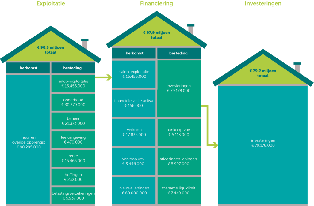 Het geld dat we in 2024 ontvingen en uitgaven laten we zien in een ‘huisjesmodel’. In het exploitatiehuis staat hoe we de ontvangen huur besteedden. In het financieringshuisje komt het geld dat we overhielden uit het exploitatiehuis, aangevuld met de opbrengsten van verkoop, nieuwe leningen en afgeloste leningen. In het investeringshuisje vindt u het geld dat we overhielden om te investeren in nieuwe huurwoningen en woningverbeteringen.